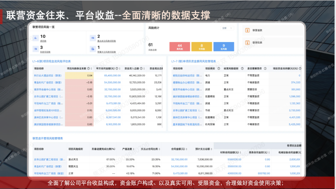 當(dāng)前公司數(shù)字化程度較低,通過簡(jiǎn)單的oa軟件、Excel表格、微信群、例會(huì)等傳統(tǒng)的管理方式進(jìn)行管理。近幾年隨著公司省外業(yè)務(wù)的拓展,項(xiàng)目越來越大,傳統(tǒng)的低效管理模式已經(jīng)無法滿足日常的管理需求。公司聯(lián)營(yíng)項(xiàng)目較多,個(gè)別項(xiàng)目出現(xiàn)資金挪用,虛開套現(xiàn),造成不必要的法律訴訟官司,甚至資金賬戶被凍結(jié)。此外,公司自營(yíng)項(xiàng)目,人材機(jī)等各項(xiàng)成本,當(dāng)前人工進(jìn)行把控,項(xiàng)目利潤(rùn)不達(dá)預(yù)期;人工進(jìn)行統(tǒng)計(jì),需要扒賬,實(shí)效性差,財(cái)務(wù)報(bào)表不能實(shí)時(shí)動(dòng)態(tài)呈現(xiàn)。