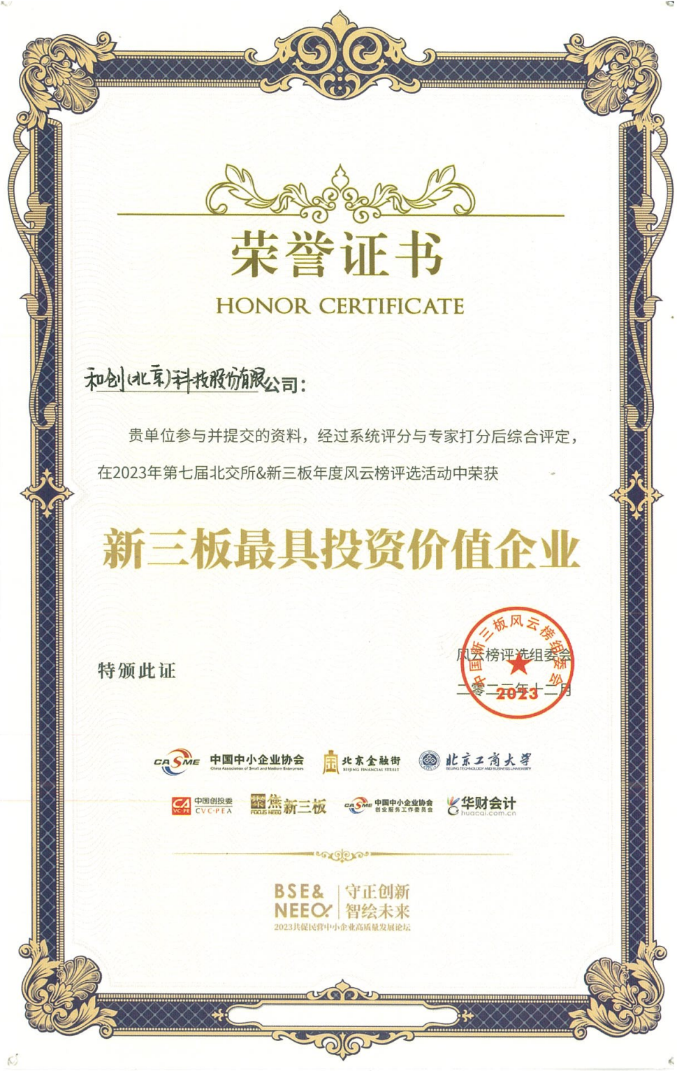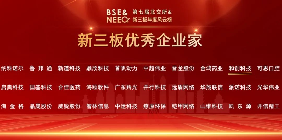 經由北交所及新三板投資者保護指數綜合評選,和創(chuàng)科技榮獲第七屆北交所&新三板年度風云榜盛典“新三板最具投資價值企業(yè)”,和創(chuàng)科技創(chuàng)始人/總經理劉學臣被評為“新三板優(yōu)秀企業(yè)家”。
