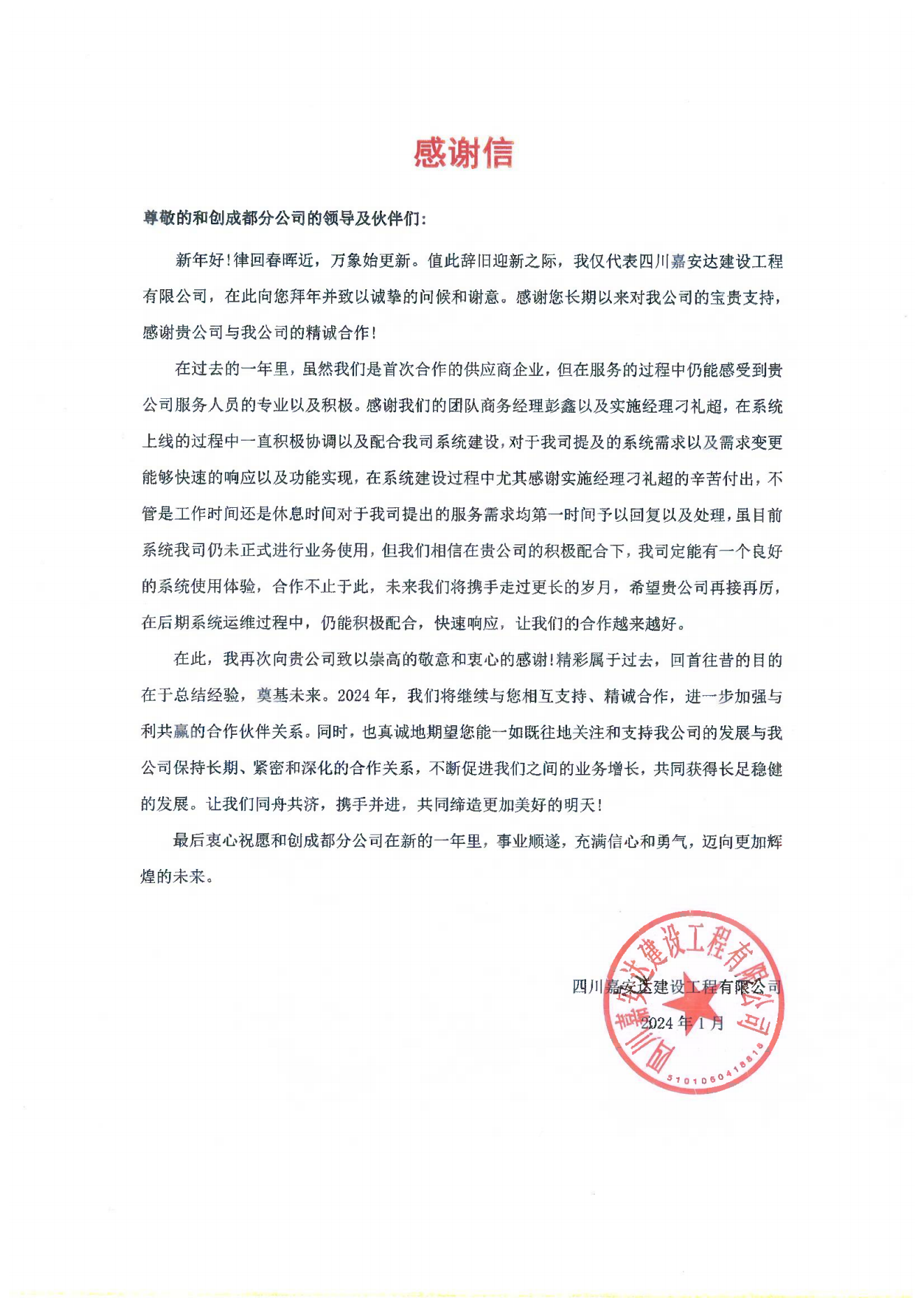 四川嘉安達(dá)建設(shè)工程有限公司向紅圈發(fā)來(lái)感謝信!客戶(hù)的認(rèn)可是我們最大的動(dòng)力!