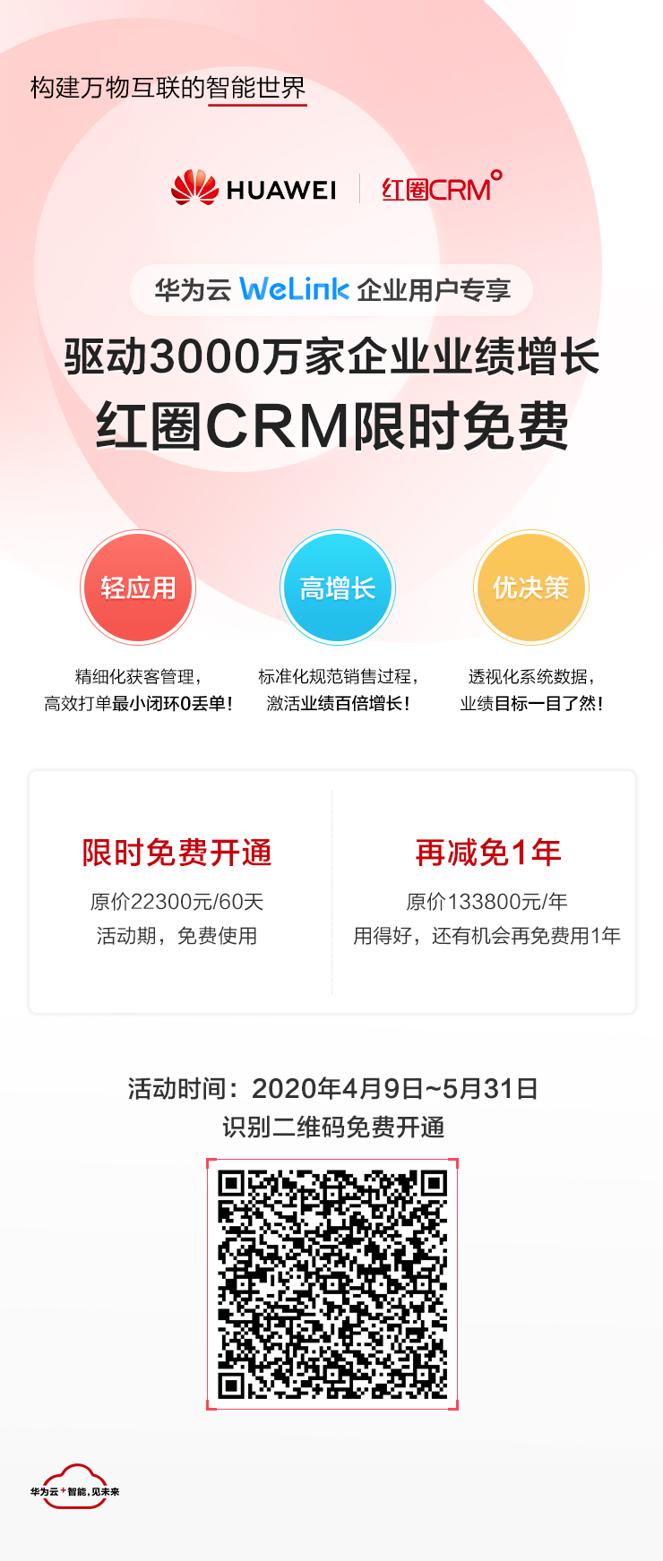 驅(qū)動(dòng)3000萬(wàn)家企業(yè)業(yè)績(jī)百倍增長(zhǎng)——紅圈CRM限時(shí)免費(fèi),#華為云WeLink#企業(yè)用戶專享,更有驚喜0元購(gòu)活動(dòng)。