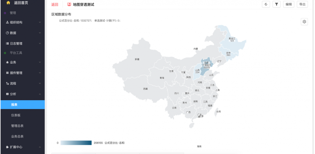- 地圖可設置默認顯示區(qū)域,區(qū)域可進行向下鉆取,如點擊北京市,可查看北京各區(qū)的數(shù)據(jù)。每個區(qū)域的顏色代表數(shù)值的大小,顏色越深數(shù)值越大