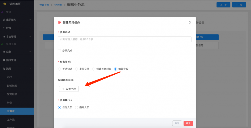 - 業(yè)務流添加階段任務,新增“編輯字段”類型任務,所有設置的字段均為必填