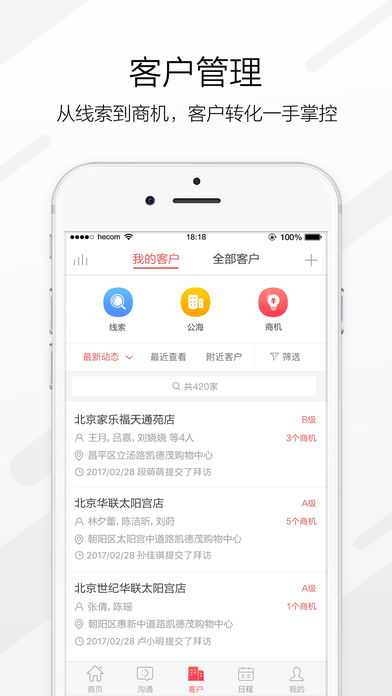 紅圈CRM是一款面向大客戶和項目制銷售團隊的移動CRM軟件,幫助企業(yè)對客戶信息以及銷售人員和客戶的互動情況進行跟蹤,打通從銷售線索到客戶、商機、合同、訂單直至回款的全流程,幫助企業(yè)縮減銷售周期、提升業(yè)績。