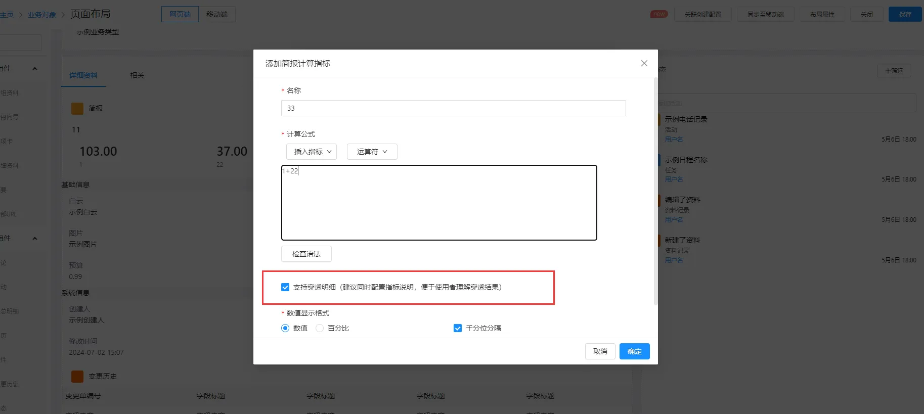 詳情頁簡報中的計算字段勾選支持穿透明細,前臺使用時可以穿透查看所有相關(guān)指標對應(yīng)的列表頁數(shù)據(jù)