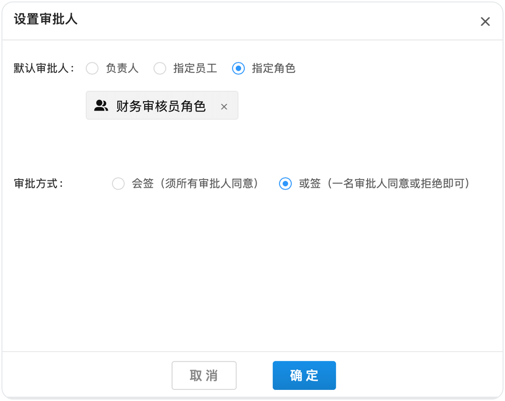 小王公司財(cái)務(wù)部有兩個同事可以進(jìn)行報(bào)銷審核,在這里可以將他們設(shè)置成“財(cái)務(wù)審核員”角色,然后在流程第二個環(huán)節(jié)使用“角色”類型審批人節(jié)點(diǎn),這樣他們就都可以收到審批流程了。當(dāng)財(cái)務(wù)審核員換人了,企業(yè)只需更換角色列表,無需調(diào)整審批流程的配置。