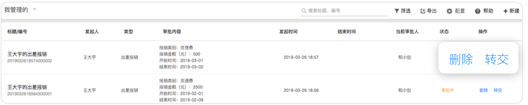 小王平時(shí)不僅會提交“出差報(bào)銷”這種辦公類審批,還會提交“合同審核”這種經(jīng)營類審批。公司希望每類審批都由專人來管理模板與數(shù)據(jù),防止敏感數(shù)據(jù)內(nèi)部泄露。這時(shí)公司可以為每個審批設(shè)置“模板管理員”,由該審批生成的全部數(shù)據(jù)將只能由這個模板管理員維護(hù)并導(dǎo)出。同時(shí)他也可以將審批中的流程轉(zhuǎn)交給其他人,以避免出現(xiàn)審批人休假或離職后流程卡住的情況。模板管理員還可以協(xié)助企業(yè)管理員來編輯審批模板,有效分擔(dān)工作。