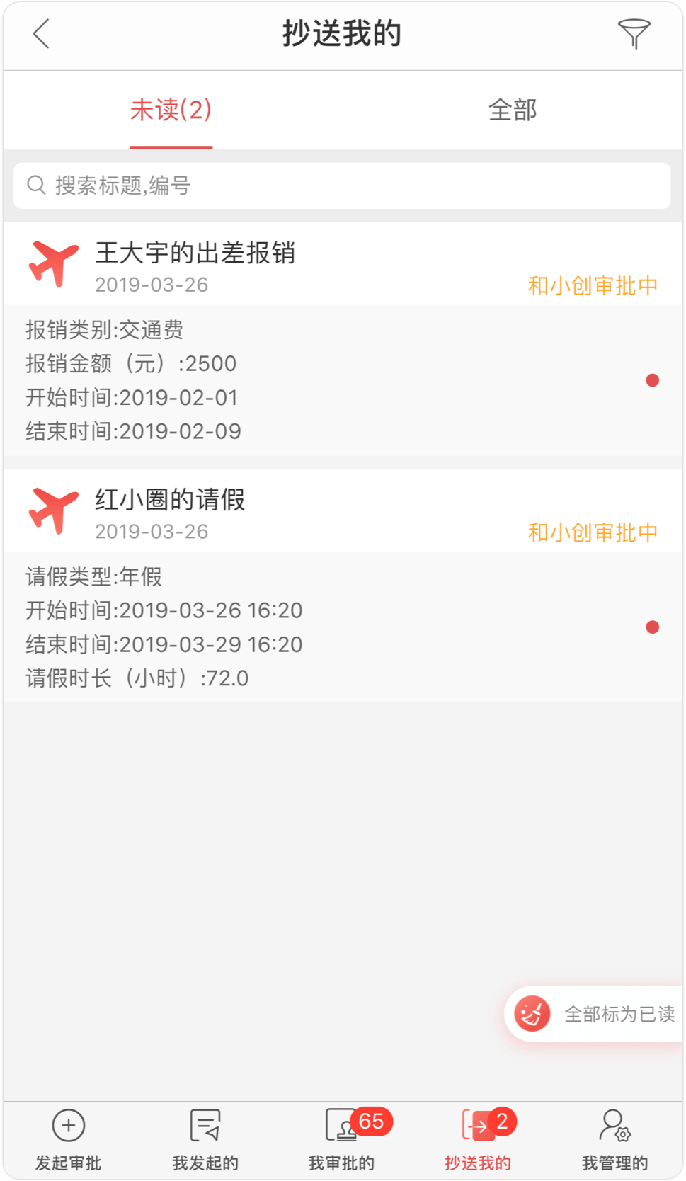 審批列表中的信息可按規(guī)律配置透出信息;抄送列表增加未讀狀態(tài),并可一鍵全部已讀;審批詳情頁信息展示更友好、高效。
