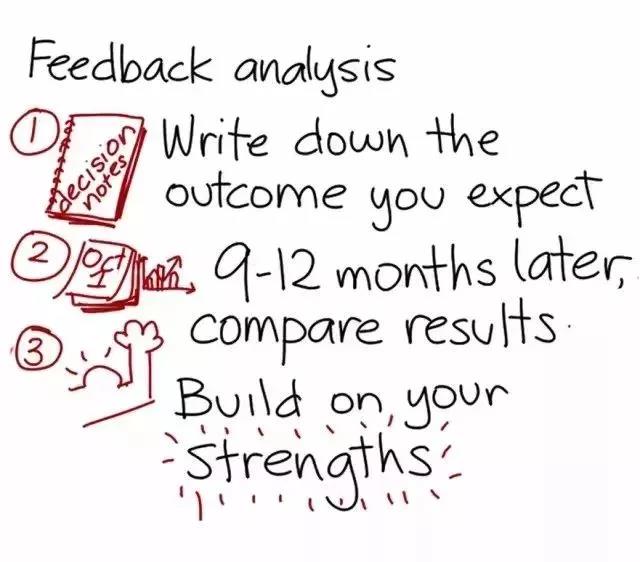 要發(fā)現(xiàn)自己的長處,唯一途徑就是回饋分析法(feedback analysis)。每當(dāng)做出重要決定或采取重要行動(dòng)時(shí),你都可以事先記錄下自己對(duì)結(jié)果的預(yù)期。9 到 12 個(gè)月后,再將實(shí)際結(jié)果與自己的預(yù)期比較。