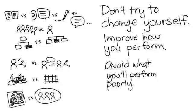 下面這個(gè)結(jié)論值得我們反復(fù)強(qiáng)調(diào):不要試圖改變自我,因?yàn)檫@樣你不大可能成功。但是,你應(yīng)該努力改進(jìn)你的工作方式。另外,不要從事你干不了或干不好的工作。