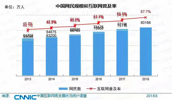 截至2018年6月,我國網民規(guī)模為8.02億,上半年新增網民2968萬人,較2017年末增加3.8%,互聯(lián)網普及率達57.7%。