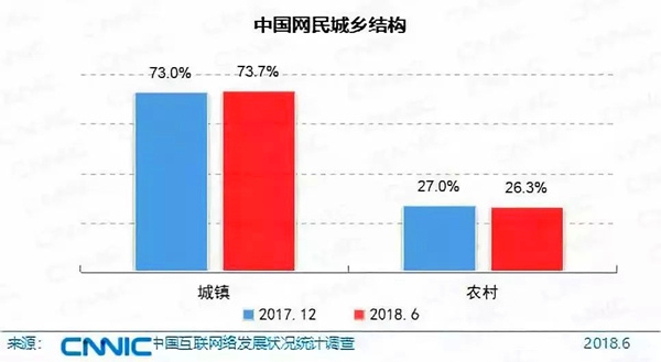 截至2018年6月,我國農村網民規(guī)模為2.11億,占整體網民的26.3%,較2017年末增加204萬人,增幅為1.0%;城鎮(zhèn)網民規(guī)模為5.91億,占比達73.7%,較2017年末增加2764萬人,增幅為4.9%。我國不斷推進城鎮(zhèn)化進程,使得城鎮(zhèn)人口不斷增加,農村人口不斷減少,城鄉(xiāng)網民結構受此影響也發(fā)生了細微變化。