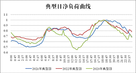 由于湖南光伏發(fā)電裝機(jī)的快速增長(zhǎng),湖南電網(wǎng)凈負(fù)荷曲線(電網(wǎng)凈負(fù)荷=電網(wǎng)負(fù)荷-新能源出力-外受電)產(chǎn)生向“鴨子型曲線”轉(zhuǎn)變的趨勢(shì)(見圖),午間腰荷時(shí)段凈負(fù)荷越來(lái)越低,該時(shí)段可再生能源消納困難情況開始顯現(xiàn)。以2023年某日為例,該日光伏發(fā)電出力較大,腰荷時(shí)段電網(wǎng)凈負(fù)荷較前兩年同期明顯下降,同時(shí)低于當(dāng)日低谷時(shí)段凈負(fù)荷,導(dǎo)致腰荷時(shí)段新能源消納更為困難。