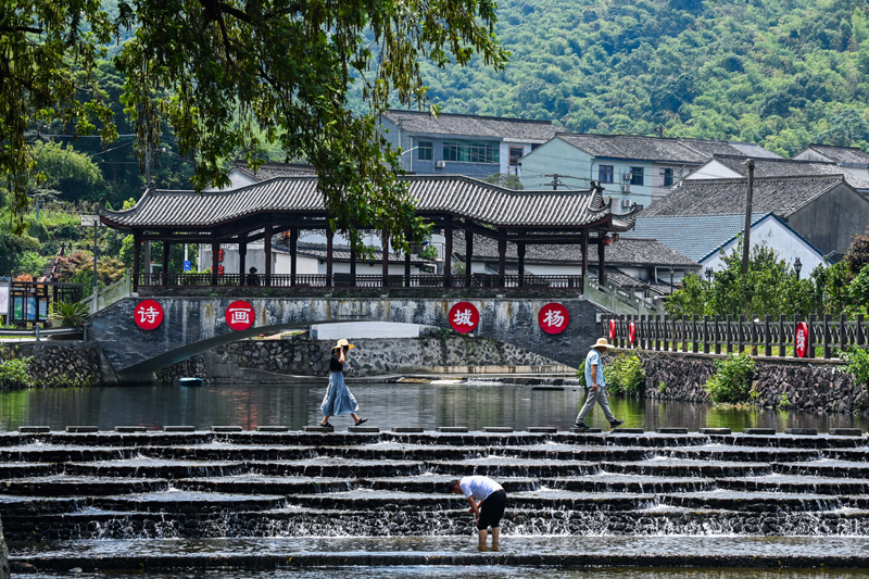 2023年8月10日,游客在浙江省寧波市鄞州區(qū)城楊村的溪流玩耍。新華社記者 徐昱 攝