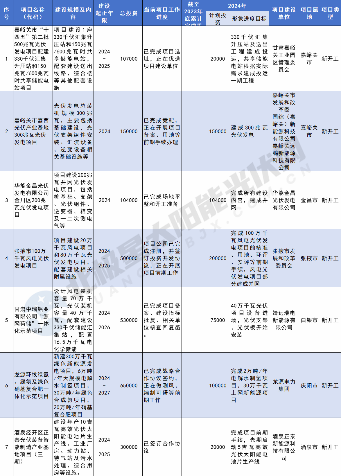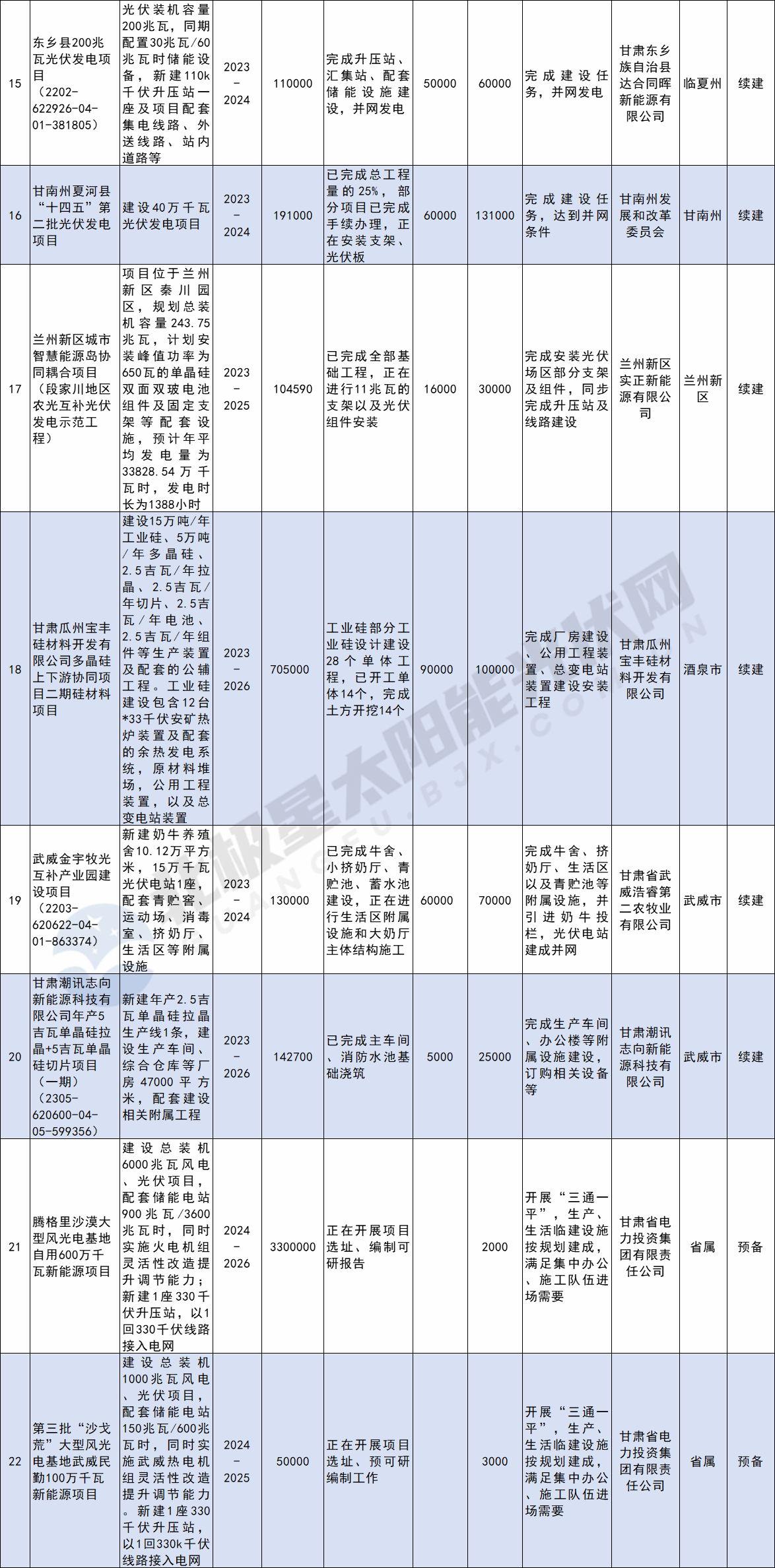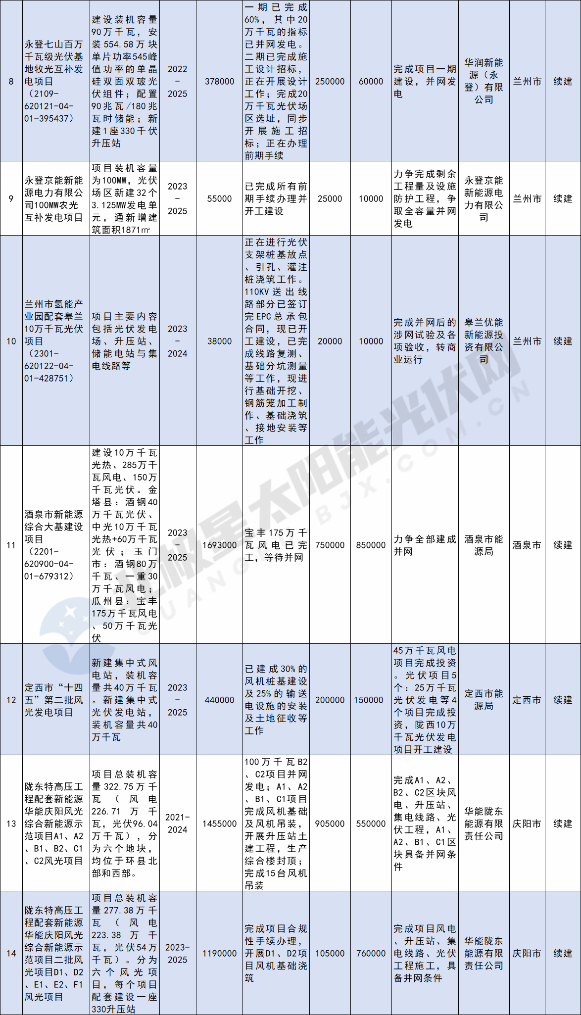 2023年12月22日,甘肅省發(fā)改委發(fā)布關于征求《甘肅省2024年省列重大建設項目投資計劃(草案)》意見的函,經梳理統(tǒng)計,共涉及11個光伏項目,總投資額達1232.329億元。項目詳情如下: