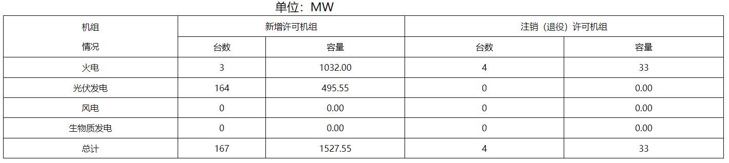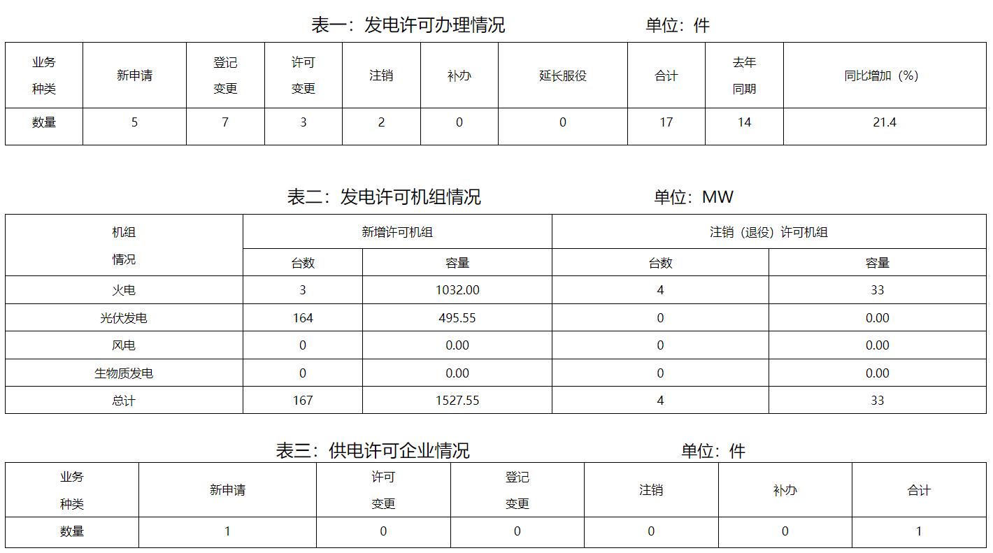 1月份,全省辦理電力業(yè)務許可證(發(fā)電類)共計17件,其中新申請5件,許可事項變更3件,登記事項變更7件,注銷2件。新增許可機組167臺(發(fā)電單元)總容量1527.55MW。