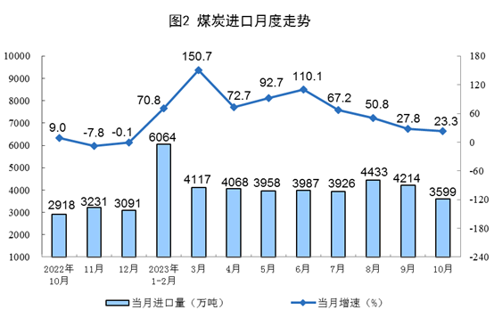 原煤生產(chǎn)增速加快,進(jìn)口較快增長。10月份,生產(chǎn)原煤3.9億噸,同比增長3.8%,增速比9月份加快3.4個(gè)百分點(diǎn),日均產(chǎn)量1254.0萬噸。進(jìn)口煤炭3599萬噸,同比增長23.3%,增速比9月份回落4.5個(gè)百分點(diǎn)。