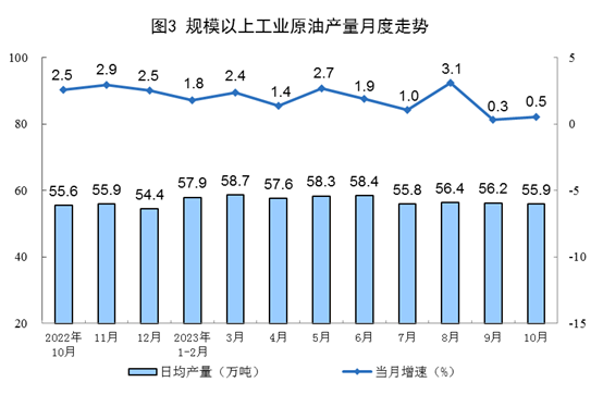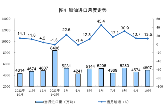 原油生產(chǎn)增速略有加快,進(jìn)口保持較快增長。10月份,生產(chǎn)原油1733萬噸,同比增長0.5%,增速比9月份加快0.2個(gè)百分點(diǎn),日均產(chǎn)量55.9萬噸。進(jìn)口原油4897萬噸,同比增長13.5%,增速比9月份放緩0.2個(gè)百分點(diǎn)。