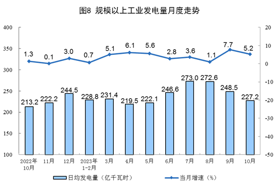 電力生產(chǎn)穩(wěn)步增長。10月份,發(fā)電量7044億千瓦時(shí),同比增長5.2%,增速比9月份放緩2.5個(gè)百分點(diǎn),日均發(fā)電227.2億千瓦時(shí)。1—10月份,發(fā)電量73330億千瓦時(shí),同比增長4.4%。