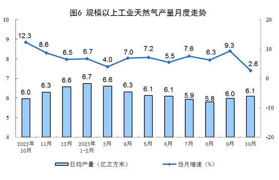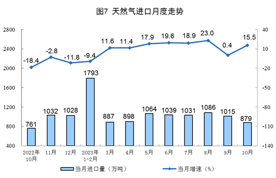 天然氣生產(chǎn)保持平穩(wěn),進(jìn)口增速加快。10月份,生產(chǎn)天然氣190億立方米,同比增長2.6%,增速比9月份回落6.7個(gè)百分點(diǎn),日均產(chǎn)量6.1億立方米。進(jìn)口天然氣879萬噸,同比增長15.5%,增速比9月份加快15.1個(gè)百分點(diǎn)。
