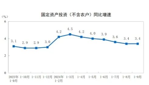 2024年1—9月份,全國(guó)固定資產(chǎn)投資(不含農(nóng)戶)378978億元,同比增長(zhǎng)3.4%。其中,民間固定資產(chǎn)投資191001億元,下降0.2%。從環(huán)比看,9月份固定資產(chǎn)投資(不含農(nóng)戶)增長(zhǎng)0.65%。