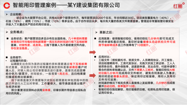 總結而言,紅圈智能印控一體化解決方案,通過 “AI核驗+數(shù)字流程+智能硬件+全場景覆蓋” 四位一體的系統(tǒng)性創(chuàng)新,真正完成了企業(yè)用印管理從被動“人防”到主動“技防”的戰(zhàn)略性跨越。它不僅以前沿技術筑牢了企業(yè)用印安全的智能防線,更通過深刻的流程再造與效率革命,推動了企業(yè)整體運營管理的提質增效,為企業(yè)在數(shù)字化時代的穩(wěn)健發(fā)展保駕護航。