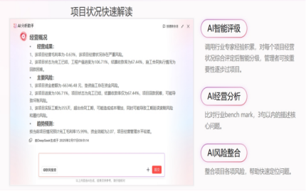 而紅圈AI的加入,則將這種可視化升級(jí)為“可解讀”、“可對(duì)話”的智能洞察。 想象一下,你不再需要費(fèi)力地閱讀圖表,而是可以直接向你的“BOSS 助理Agent”提問(wèn):“小王,這個(gè)月公司現(xiàn)金流怎么樣?哪個(gè)項(xiàng)目成本超支最嚴(yán)重?”。這位BOSS 助理Agent能借助大模型的推理能力,精準(zhǔn)挖掘企業(yè)自有數(shù)據(jù)模型,用自然語(yǔ)言向你匯報(bào)全面、準(zhǔn)確的經(jīng)營(yíng)數(shù)據(jù),甚至能主動(dòng)指出異常和風(fēng)險(xiǎn)點(diǎn),讓洞悉經(jīng)營(yíng)狀況變得像聊天一樣簡(jiǎn)單。更進(jìn)一步。紅圈AI的“項(xiàng)目360°AI解讀”,能整合資金、成本、合同、付款等全維經(jīng)營(yíng)指標(biāo),一鍵生成項(xiàng)目的全景“作戰(zhàn)圖”。 不再只是展示數(shù)據(jù),更能通過(guò)大模型深度解讀數(shù)據(jù)背后的經(jīng)營(yíng)風(fēng)險(xiǎn)與應(yīng)對(duì)策略,將復(fù)雜的專業(yè)數(shù)據(jù)轉(zhuǎn)化為管理者一眼就能看懂的決策語(yǔ)言,真正讓管理全局盡在掌握。這能幫助解決傳統(tǒng)經(jīng)營(yíng)會(huì)議中因會(huì)前準(zhǔn)備不足、數(shù)據(jù)錯(cuò)漏導(dǎo)致的效率低下問(wèn)題。