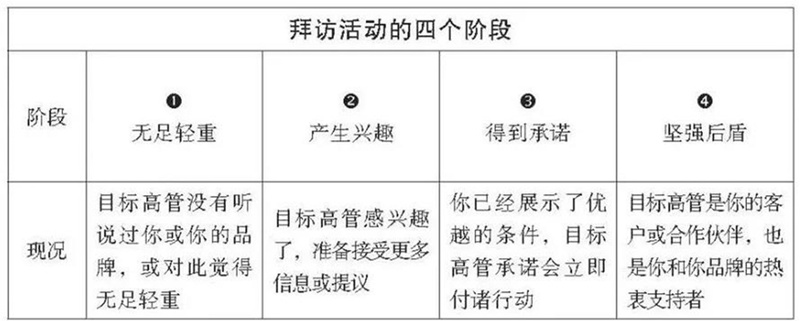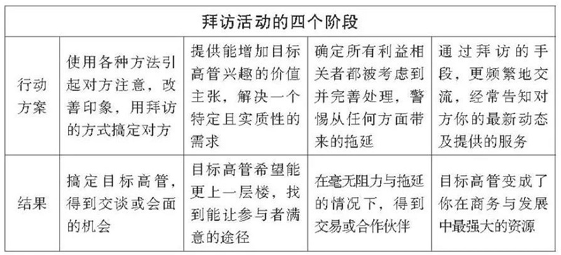 亞馬遜創(chuàng)始人杰夫· 貝佐斯有句很出名的話:“一個人的品牌就是人們背著他時做的評論。”拜訪工作能直接影響他人,尤其是處于第四階段的目標(biāo)高管對你的評論。難道持續(xù)地提供你的信息并與他們保持聯(lián)系不是最合情合理的策略嗎?當(dāng)然是。
