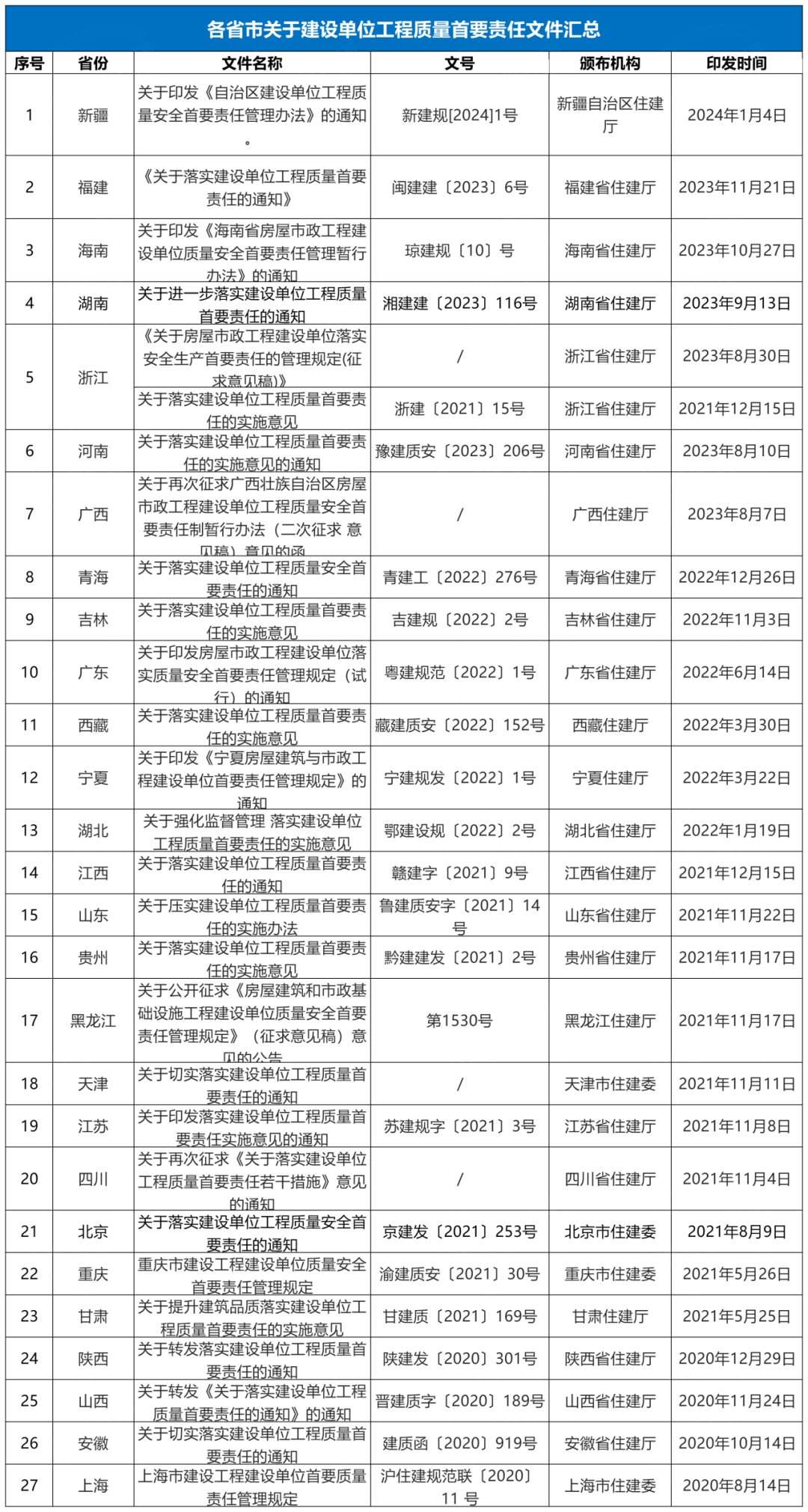 截至目前,27省市已經(jīng)發(fā)文跟進住建部《關(guān)于落實建設(shè)單位工程質(zhì)量首要責任的通知》(建質(zhì)規(guī)〔2020〕9號),嚴格落實建設(shè)單位工程質(zhì)量首要責任。