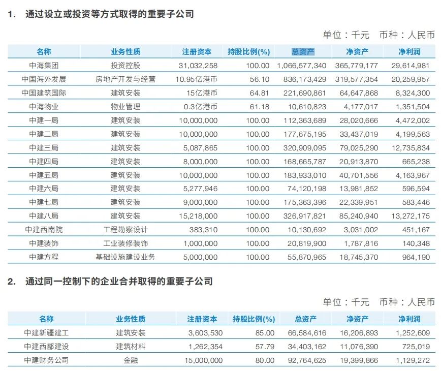 2023年度報(bào)告中,中國建筑公布重要子公司的總資產(chǎn)、凈資產(chǎn)和凈利潤等數(shù)據(jù),具體如下: