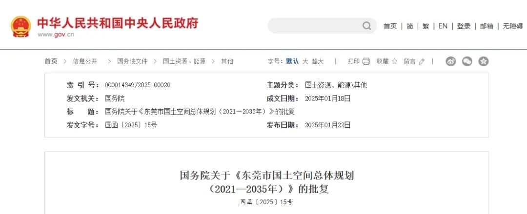 國務院關于《東莞市國土空間總體規(guī)劃(2021—2035年)》的批復