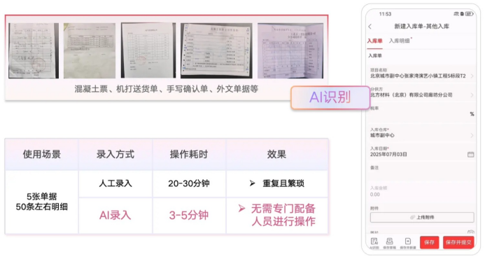 紅圈AI錄單助手就是來干這活的,靠大模型自動識別各種單據(jù),從圖像識別到錄入系統(tǒng),秒級閉環(huán)。甭管是混凝土票、機打送貨單,還是手寫的確認單,系統(tǒng)自動提取關(guān)鍵信息,匹配業(yè)務(wù)數(shù)據(jù)后回填。這一下就干掉90%的人工操作,也干掉了人工錄入可能帶來的所有錯漏。入庫材料自動跟合同明細掛上鉤,每一分錢的成本從哪來的,查得清清楚楚,后期想統(tǒng)計實際成本、追溯源頭,那是真方便。